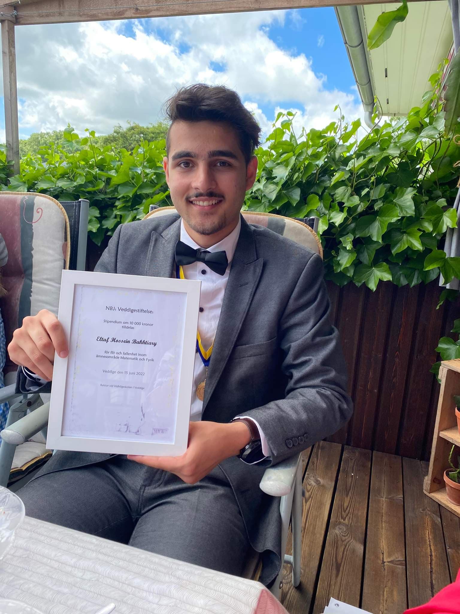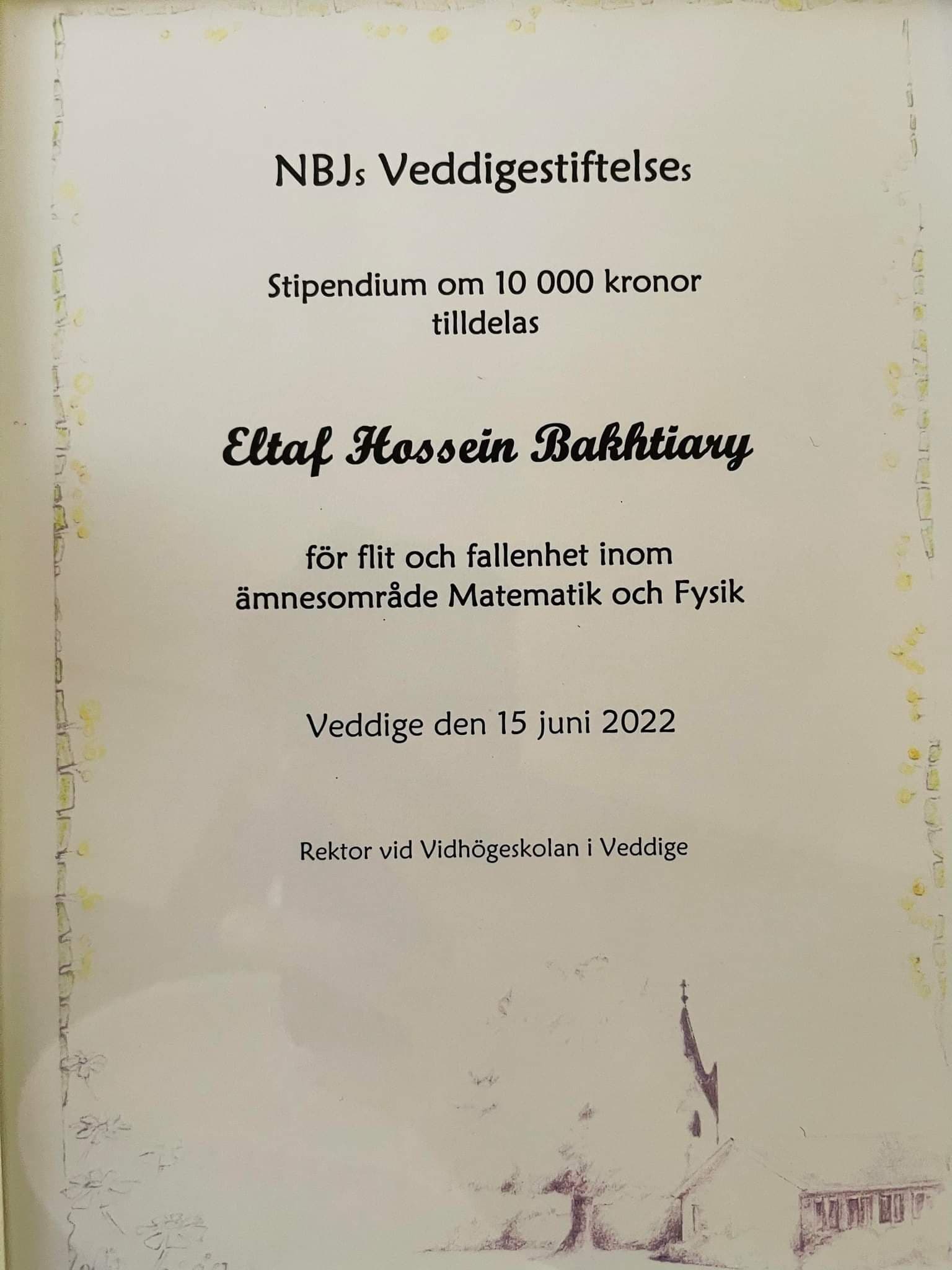 او د ر15 جون امسال استیپندیوم ( Stipendium) [ کمک هزینه تحصیلی] شامل مبلغ 10 هزار کرون بخاطر لیاقتش در مضامین ریاضی و فزیک را از طرف مکتب به امضای مدیر مکتب (Vidhögeskolan) دریافت نمود.