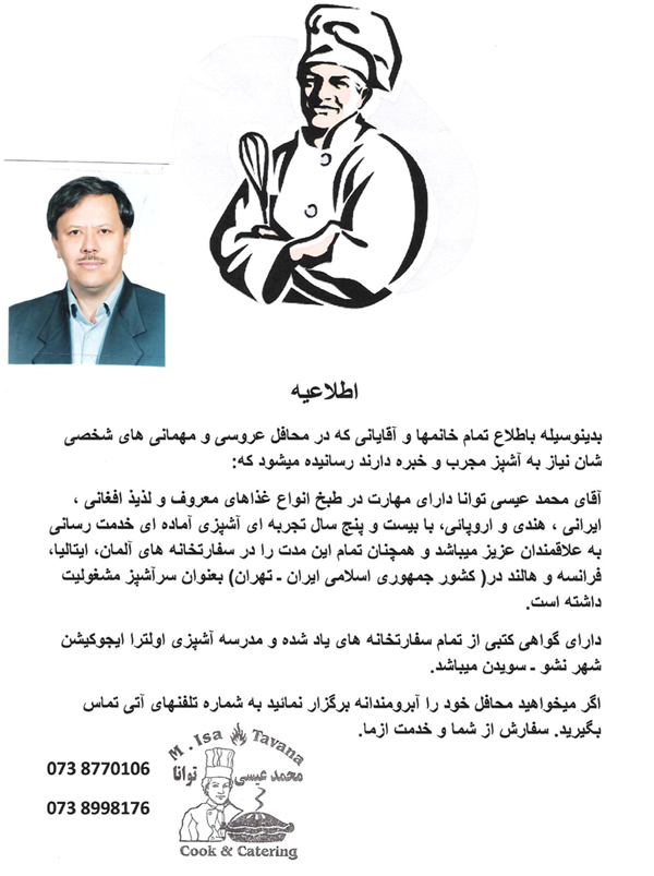 بدينوسيله به اطلاع همه عزيزان رسانيده ميشود که آقاي محمد عيسي توانا داراي مهارت در طبخ انواع غذاهاي معروف ولذيذ افغاني ، ايراني، هندي واروپايي،با بيست وپنج سال تجربه اي آشپزي آماده اي خدمت ميباشد. شماره هاي تماس 0738770106 و 0738998176