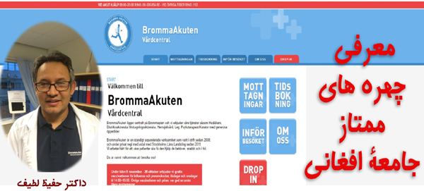 داکتر حفیظ لطیف: من در سال 2011 یک کینیک شخصی را در محلۀ  Solnaدر استکهلم تاسیس کردم که بعداَ از آنجا بهBromma  نقل مکان نمودیم. کلینیک ما  BrommaAkutenنام دارد و شامل بخش های مختلف مانند داخلۀ عمومی، ارتوپیدی، امراض نسایی و روانشناسی بوده، ما (Logoped) یا ”معالج گفتار” نیز داریم. ضمناَ ما دارای سیستم (Drop in) نیز هستیم، یعنی مریضان محترم میتوانند حتی بدون ریزرف نمودن وقت ملاقات نیز میتوانند نزد داکتر مراجعه نمایند.ما در حال حاضر حدود ده هزار نفر نزد ما خود را ثبت نام کرده اند که برای معالجه نزد ما مراجعه میکنند. باید یادآور شوم که ما در گذشته حتی یک بخش عاجل را نیز در کلینیک خود داشتیم که تا ساعت ده شب فعالیت میکرد ولی بعداَ نظر به تغییراتی کهLandstinget وارد آورد، وادار شدیم به دلایل اقتصادی فعالیت های این بخش را برخلاف میل و ارادۀ خود پایان ببخشیم. فعلاَ کلینیک از ساعت هشت صبح تا هشت شام به روی مریضان محترم باز است.