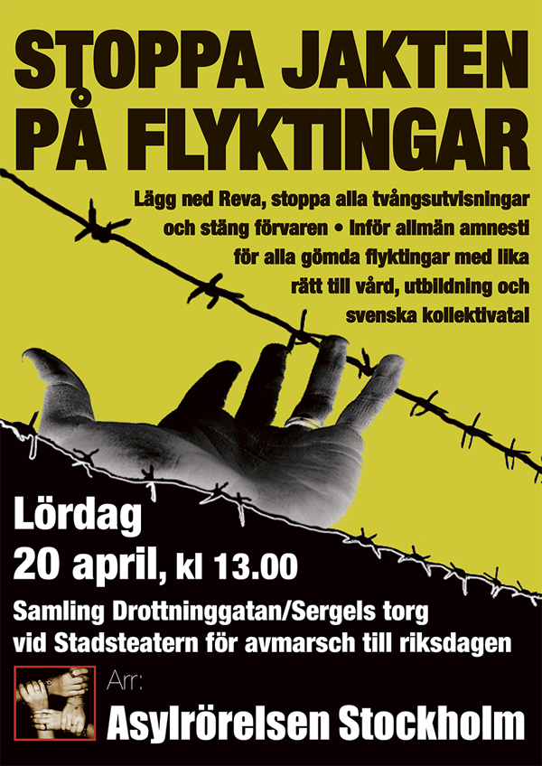 قرار است بتاریخ 20 اپریل ، روز شنبه تظاهراتی در مخالفت با تعقیب پناهجویان بدون اسناد و اخراج اجباری پناهجویان از سویدن در شهر استاکهولم برگزار گردد.این تظاهرات از طرف نهضت پناهجویان استاکهولم واشتراک تعداد زیادی از انجمن های مدافع حقوق پناهجویان ومنجمله انجمن افغانها راه اندازی میگردد. قرار است یک کمیته سازماندهی تظاهرات پناهجویان افغان ایجاد گرددوسهم همه آزاداست