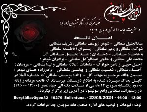 عبدالجلیل سلطانی – شوهر ؛ یوسف سلطانی ، شریف سلطانی ، شوکت سلطانی و پامیر سلطانی – پسران ؛ فاطمه سلطانی و هاجره سلطانی – دختران ؛ عبدالجمیل سلطانی ، محمد علی سلطانی و حاجی عبدالوکیل سلطانی – برادران شوهر ؛ اجمل حبیبی و ناصر خوازک – دامادان ؛ عادله سلطانی و لیدا سلطانی – عروسان ؛ آصف سلطانی ، شعیب سلطانی و یونس سلطانی – برادرزاده های شوهر ؛ نسبت وفات مرحومه مهتاب گل – والده یوسف سلطانی که جنازه قبلا در کابل بخاک سپرده شده به اطلاع دوستان میرسانند که فاتحه مردانه و زنانه به روز یکشنبه مورخ 23 ماه می از ساعت یک الی چهار عصر ( 13.00 -16.00) در رستورانت سلطانی واقع سولینتونا در آدرس زیر برگزار میگردد.