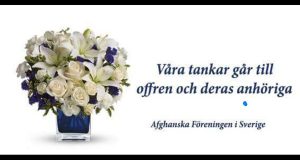 انجمن افغانها در سویدن این عمل تروریستی را شدیدا تقبیح کرده برای خانواده ها وبازماندگان قربانیان تسلیت عمیق خود را ابراز میدارد وبرای زخمیان صحت عاجل آرزو مینماید